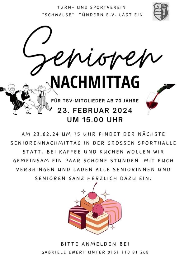 Für TSV-Mitglieder ab 70 Jahren bieten wir am 23.02.2024 um 15.00h in der Sporthalle Lawerweg einen Seniorennachmittag an.