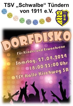 Der TSV veranstaltet am Samstag, 27.04.24 für Jung und Alt eine Dorfdisko in der TSV-Halle . Eintritt ist natürlich frei.