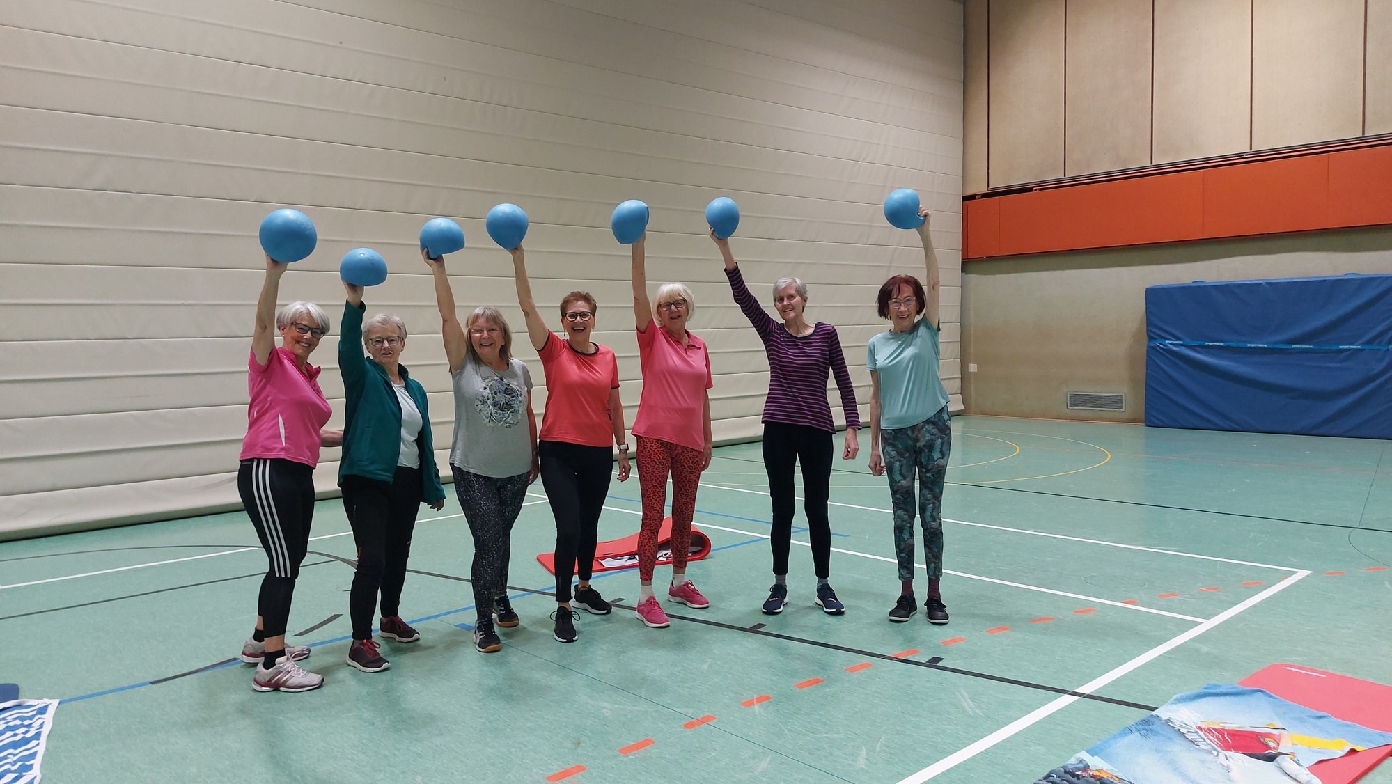 Während der ersten zehn Minuten etwa bewegen sich die Teilnehmerinnen zu Musik in der Halle und nutzen diese Zeit auch um sich miteinander auszutauschen. Danach wärmen wir uns zu flotter Musik in Kreis- oder Blockformation mit Aerobicschritten und -kombinationen auf, studieren ab und zu Line Dances ein, kommen auf den Steppern ins Schwitzen und/oder greifen zu diversen Kleingeräten wie Hanteln, Therabändern, Bällen, Stäben und und und…