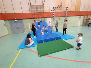 Wir erklimmen Mattenberge, springen über hohe Kästen, balancieren mutig über den Schwebebalken, rollen die schiefe Ebene herunter, bezwingen den Barren oder das Reck, kriechen durch Tunnel und allerlei mehr. Die Kinder erleben spielerisch die Sporthalle, turnen an den Gerätelandschaften, sehen die vielfältigen Möglichkeiten des Turnens und wachsen in jeder Turnstunde ein bisschen über sich hinaus. Man kann sagen, unsere Turnstunde ist immer ein Erlebnis.